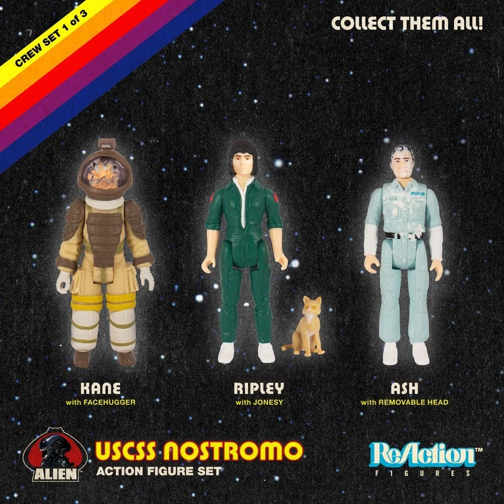 Celebrate the classic sci-fi survival horror film Alien with this fantastic official ReAction figure set featuring Ripley with Jonesy, Kane and Ash!
