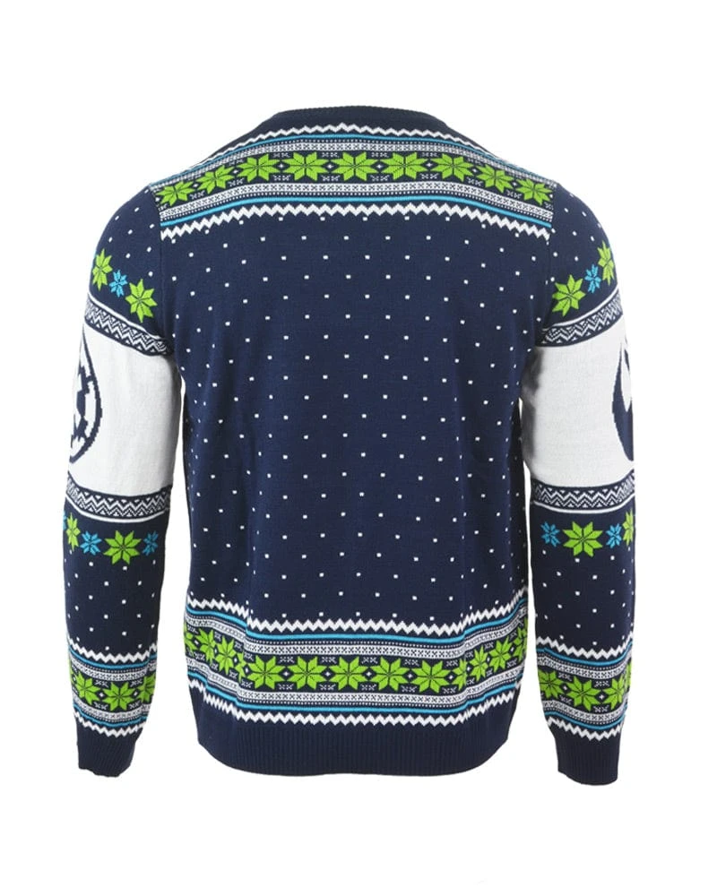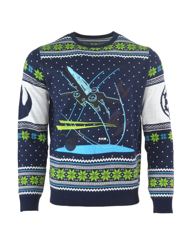 The battle for the galaxy is never over β and neither is the hunt for a decent geeky Xmas jumper! This official Star Wars Christmas sweater more than fits the bill, with its knitted feel and high quality embroidery depicting an X-Wing ship in the midst of battle. This is a great pick for your Christmas Jumper Day wear!